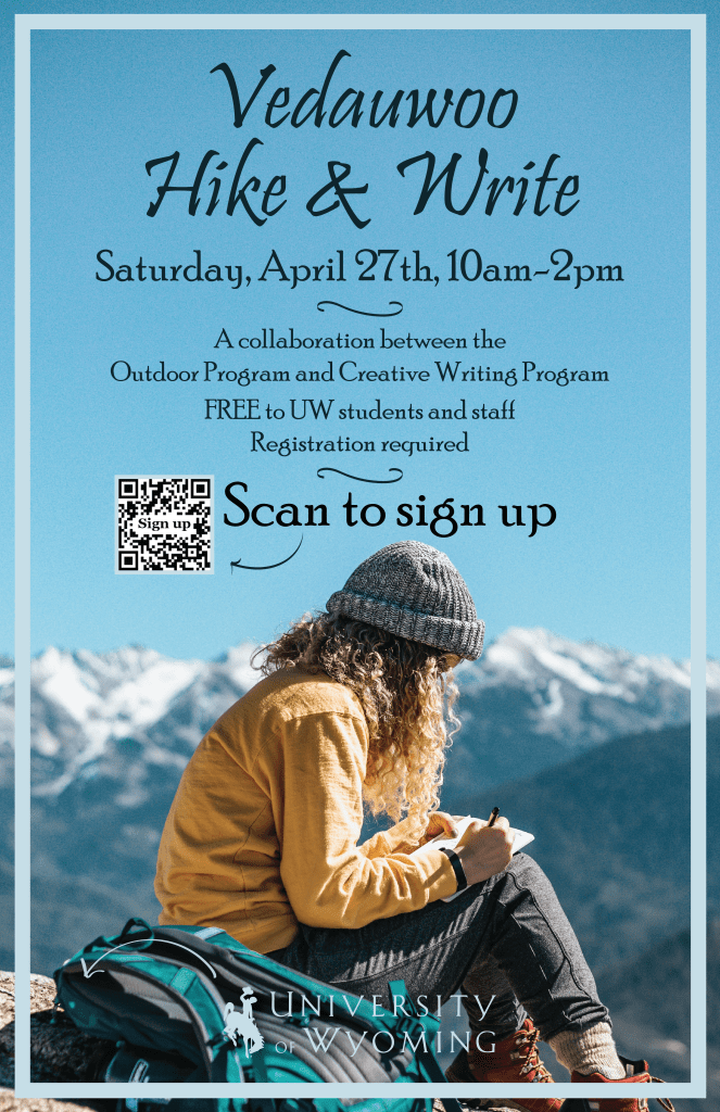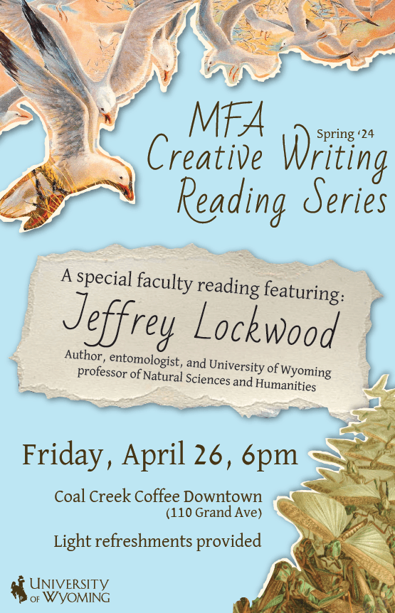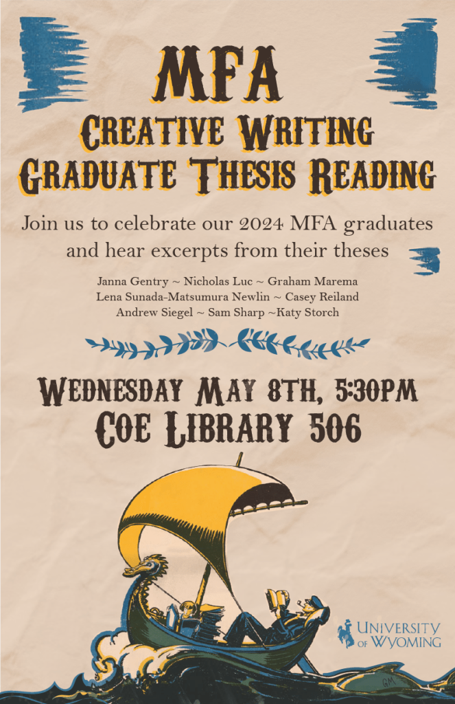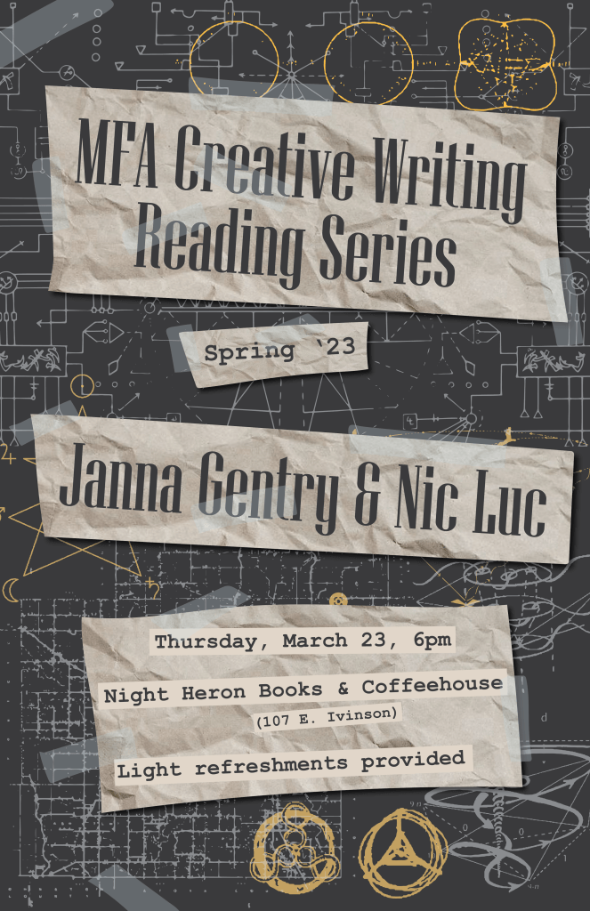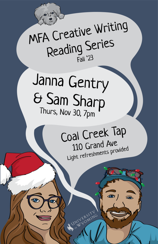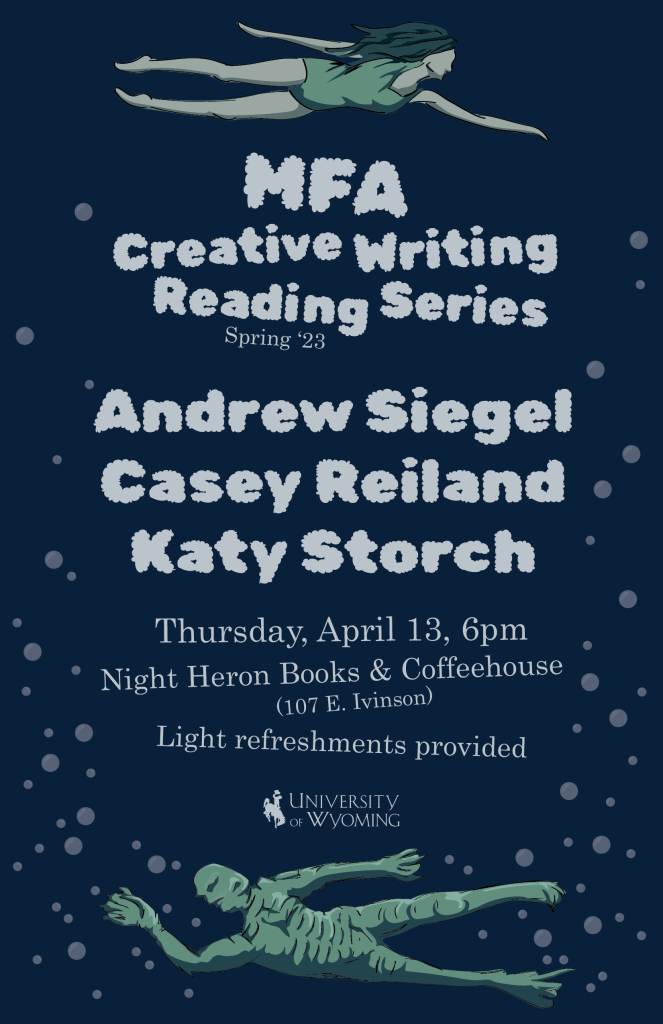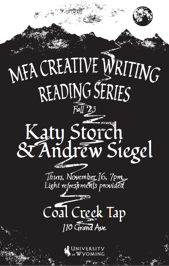 A sample of print posters designed for the University of Wyoming’s 2022-2024 community MFA reading series held at Coal Creek Coffee and Night Heron Books.